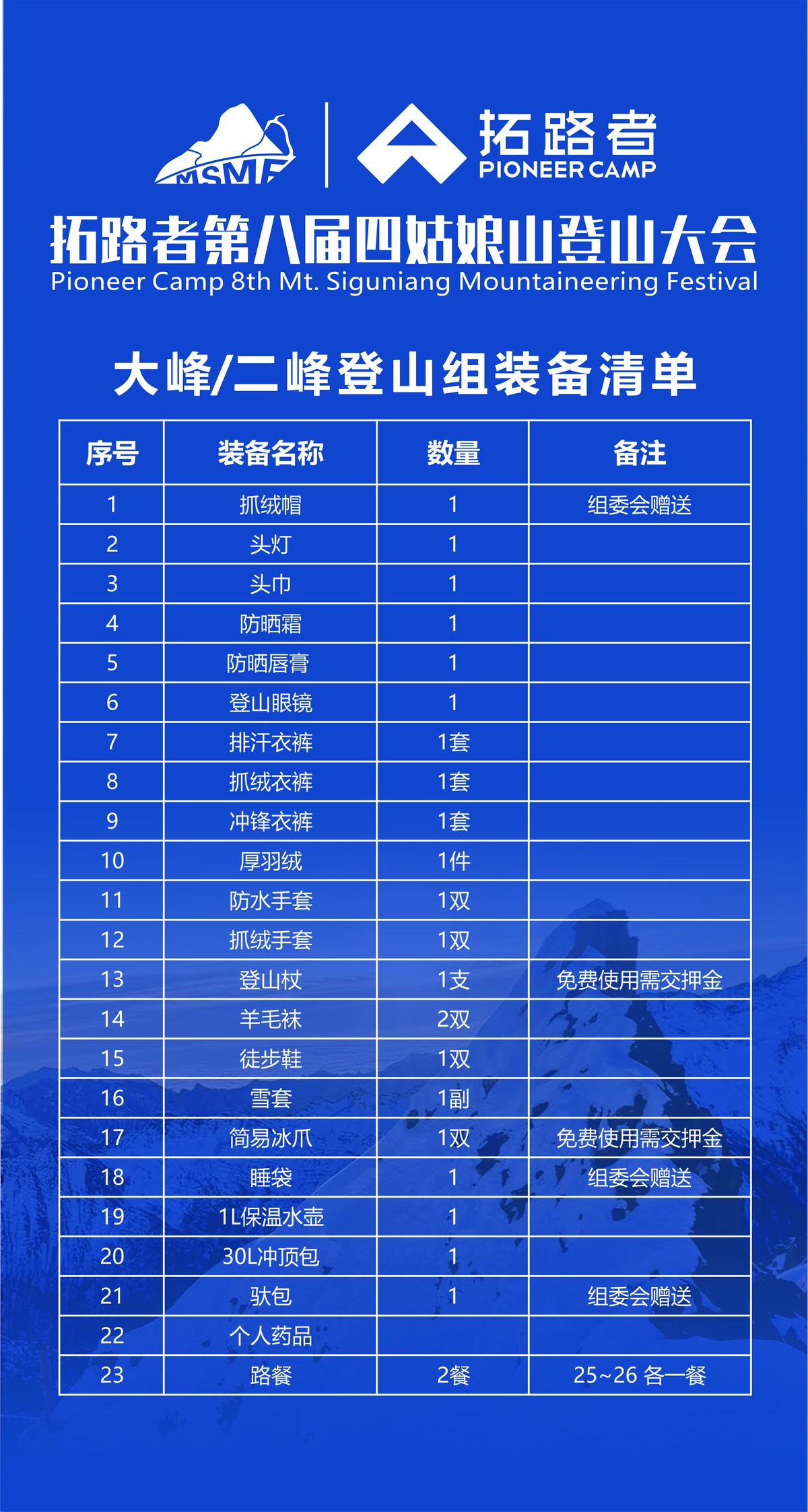25年6月的时候刷到拓路者一条推送:四姑娘山第八届登山大会报名通道开启,想着2月份在萨武留下的遗憾,这次有机会可以弥补了,看了下日期在10.25 ,恰好周末,和媳妇商量了下,便直接缴费报名了,价格比商团便宜了些,1899,有参赛包,但不含来回成都的大交通,但参赛包的价值已经有五六百了,整体打平,大会分为:传统攀登组/速攀组,本次报名的事传统组,速攀挑战太大了,还需要再沉淀下心肺能力
