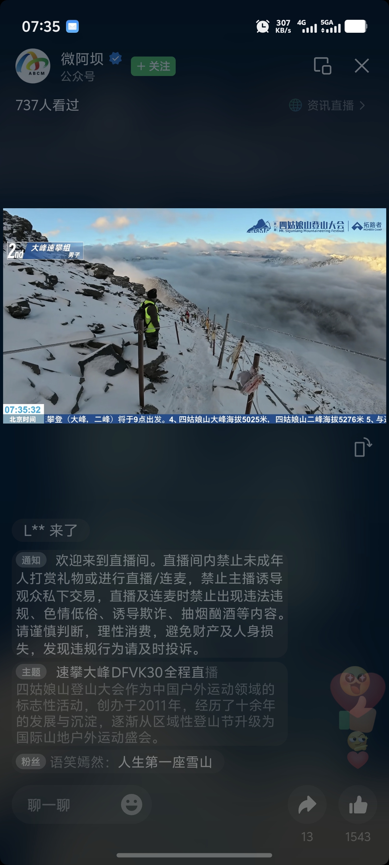 第一天的路线说难也不难,说容易也不容易,总共12公里左右的路程,海拔上升1000米,不亚于爬个奥太娜了 传统攀登组出发时间为9点到10点,我们出发的时候速攀组也下来了,第一名成绩为 2小时26分,太强了!2小时26分钟跑完全程16公里,海拔上升1800/下降1800 等待队友的时候(二次分组,一组大概20人),全程看着速攀组的直播,有一说一,风景真漂亮,对我们第二天的冲顶也有了几分期待