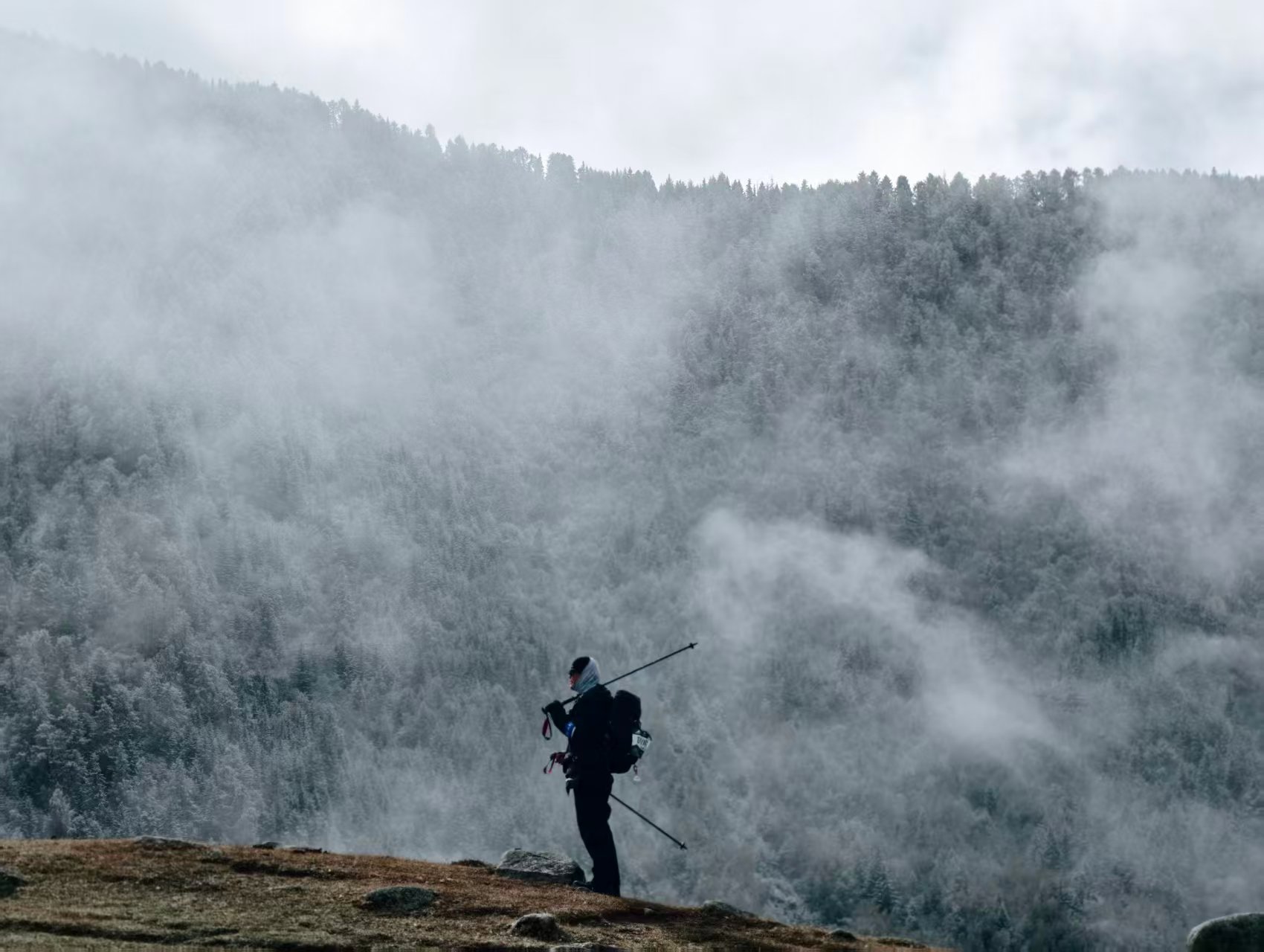 我们大致是9点30多出发,10点抵达第一个打卡点:朝山坪,海拔上升300米左右,此时云逐渐散开,远处的雾凇/雪山/云朵,十分美丽