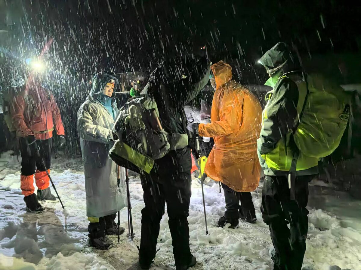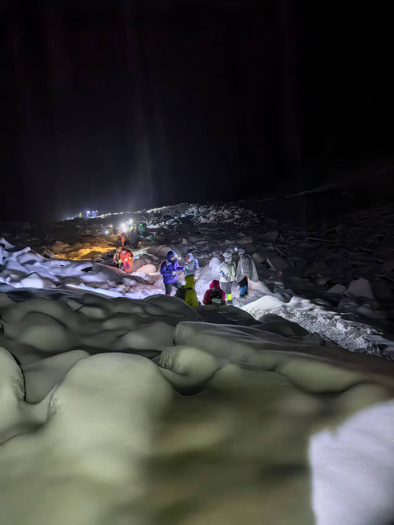 在餐区也没吃什么东西,大概一个鸡蛋/半个馒头,穿好冰爪/羽绒后,3点20就出发了 这里要提醒下: 向导:我们需要把羽绒内胆塞进包里,到了垭口风大了再穿,冰爪也是,如果你出发就穿上,会出汗,一出汗就很容易会失温 但我看外面的积雪已经快1公分了,而且气温到了零下10度,此时不穿冰爪和羽绒,会有点危险,出发前还是穿上了,其他队友见我穿上,有几个也穿上了 这里要说明下:雪山冲顶过程中,一定要学会动态穿衣,如果觉得冷,就加衣服,觉得路难走就穿冰爪,按照规则按部就班是很不明智的