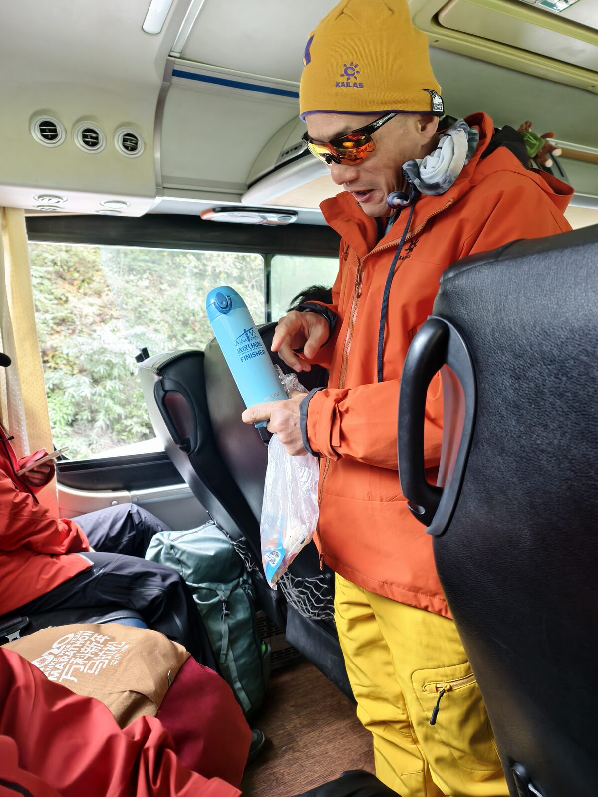 好巧不巧,上车的时候只剩后排5个座位了,结果同坐的另外两个也是个话痨,四个人一路叽叽喳喳,车上除了我们几个,全在睡觉,甚至前排小姐姐还出言提醒了下(实属抱歉),中间的大爷也是从深圳过来的,背的包是万科马拉松的,水壶也是某马拉松,衣服是另一个活动,全身装备都是攒的,一直在给我们介绍,70岁高龄了,状态还非常好,我们打趣他为「拼好爷」,另一个小姐姐则是速攀组的大佬,此前有过越野跑的经验。也是吃货一枚,在给我们介绍成都当地有哪些好吃的店